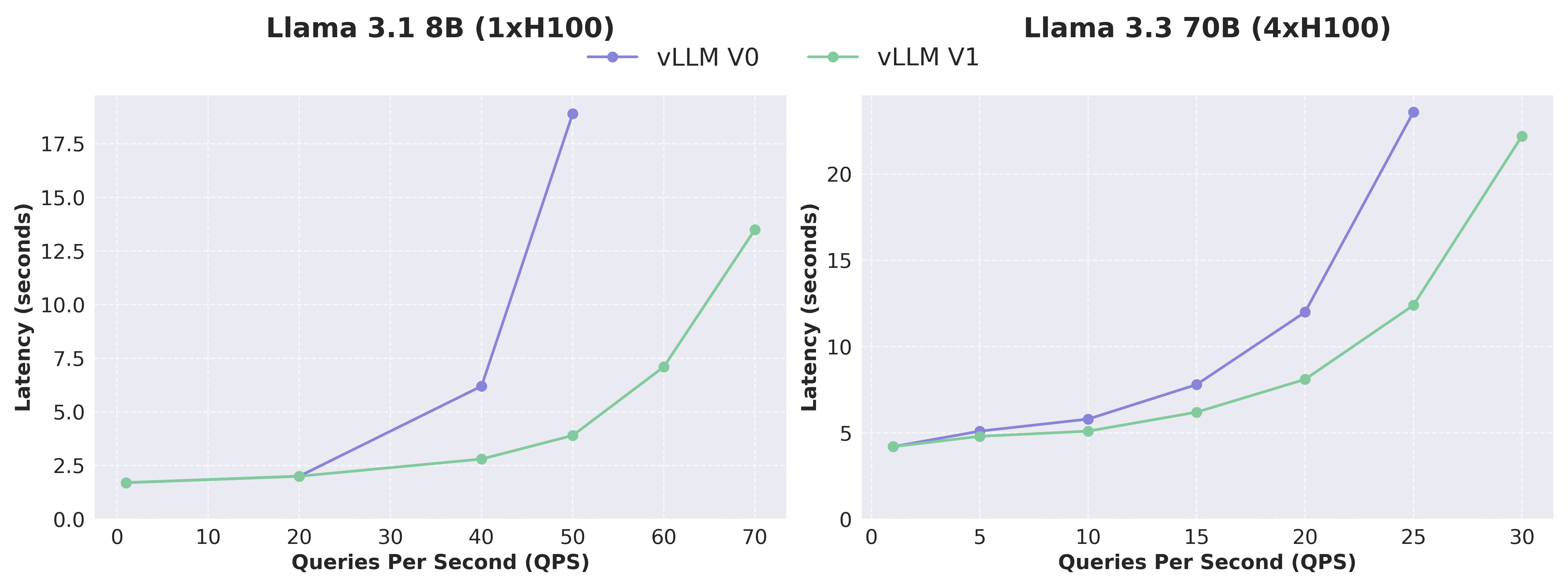 We measured the performance of vLLM V0 and V1 on Llama 3.1 8B and Llama 3.3 70B models using the ShareGPT dataset. V1 demonstrated consistently lower latency than V0 especially at high QPS, thanks to the higher throughput it achieves. Given that the kernels used for V0 and V1 are almost identical, the performance difference is mainly due to the architectural improvements (reduced CPU overheads) in V1.