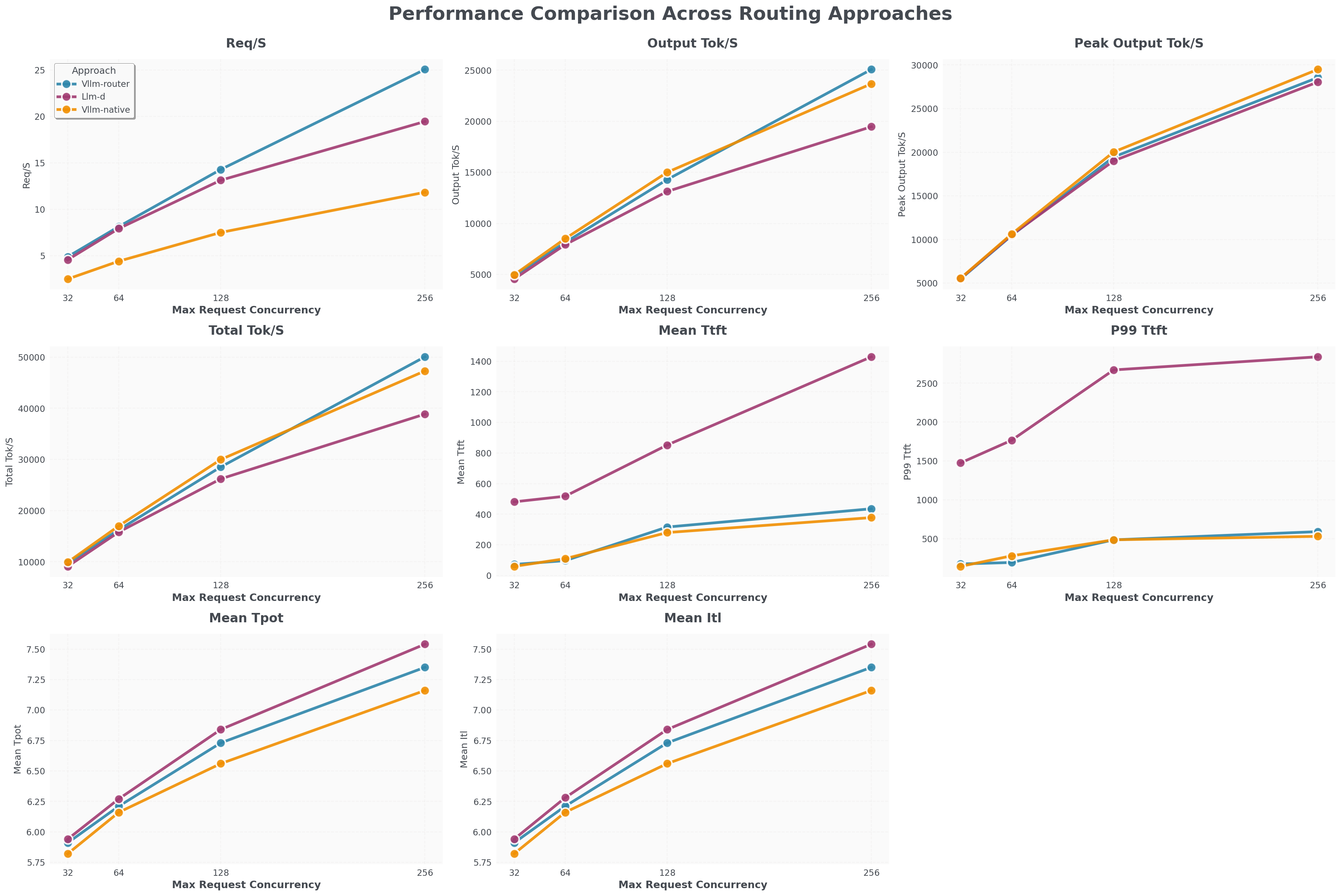 - vLLM Router (blue line) Req/S throughput is 25% higher than llm-d (purple line) and 100% higher than K8s-native load balancer (orange line).